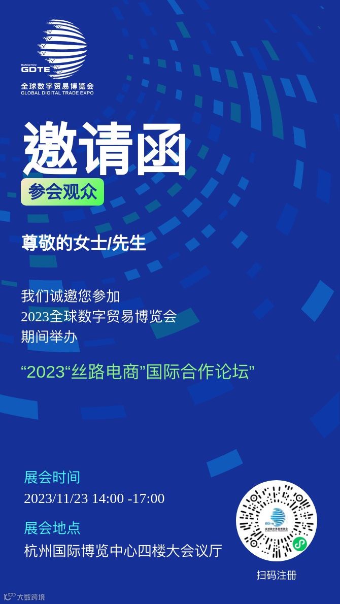 全球数字贸易博览会是以数字贸易为主题的国家级国际性展会,是共商共建共享数字贸易规则制度体系的全球平台。由商务部、浙江省人民政府联合主办的“2023丝路电商国际合作论坛”活动作为全球数字贸易博览会的重要组成部分、数贸会标志性活动之一,也是目前丝路电商领域最高级别的活动,将于2023年11月23日在杭州举行。诚邀各位出席本次论坛,现将相关事项明确如下: