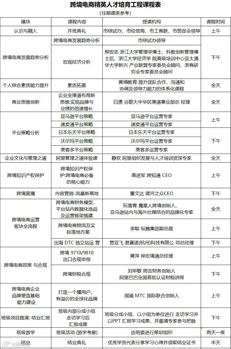 2024跨境电商精英人才培育工程第十五期培训班包括模块:名师授课、素质拓展、班级游学。通过设置丰富实用的培训课程,结合党政界、企业界、知识界、媒体界四界联动的特色优势,为全市跨境电商企业搭建学习、交流、成长和后续服务为一体的服务体系,培育一批有影响、有社会责任的跨境电商人才。