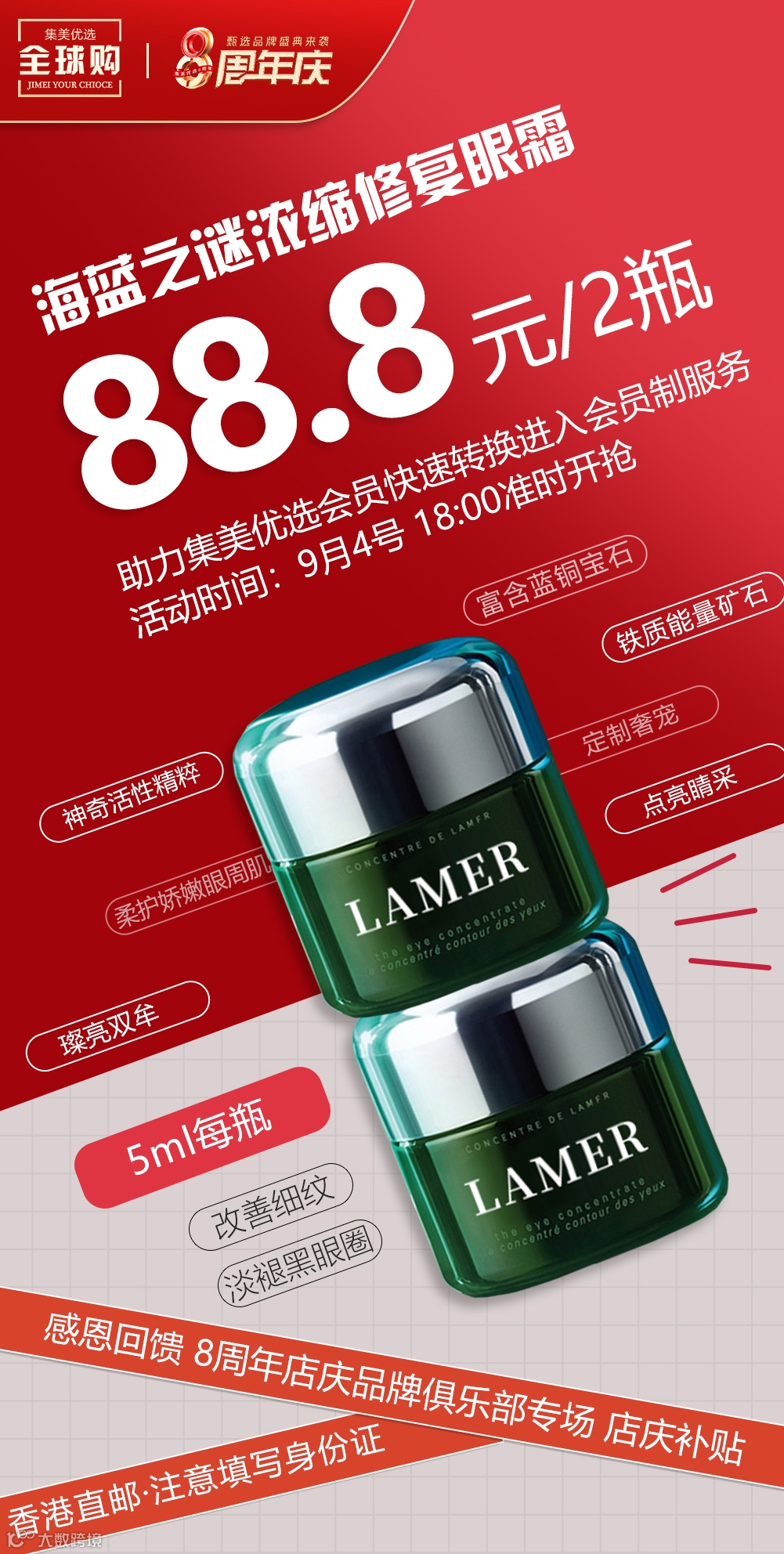 【海蓝之谜美妆】LA MER/海蓝之谜浓缩修复眼霜5ml*2罐 原价:138元 粉丝群补贴价:88.8元