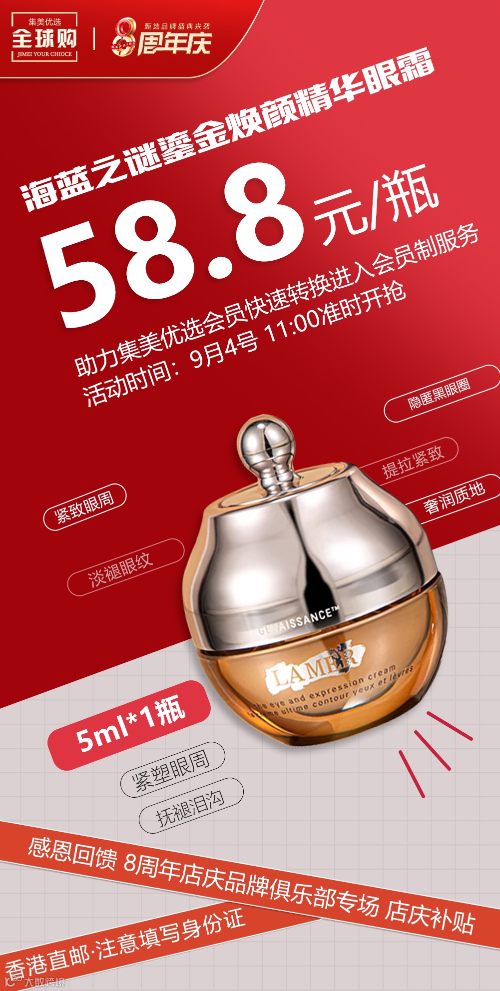 【海蓝之谜美妆】LA MER/ 海蓝之谜鎏金焕颜精华眼霜 5ml*1瓶 原价:199元 粉丝群补贴价:58.8元