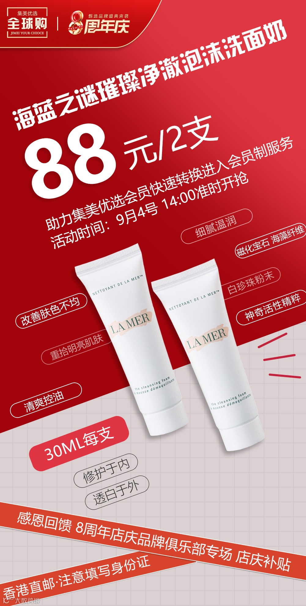 【海蓝之谜美妆】LA MER/海蓝之谜璀璨净澈洁面泡沫洗面奶 30ml*2支 原价:129元 粉丝群补贴价:88元