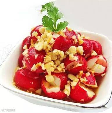材料:樱桃萝卜200克,熟花生碎50克,酱油,醋,盐,糖,辣椒油各适量