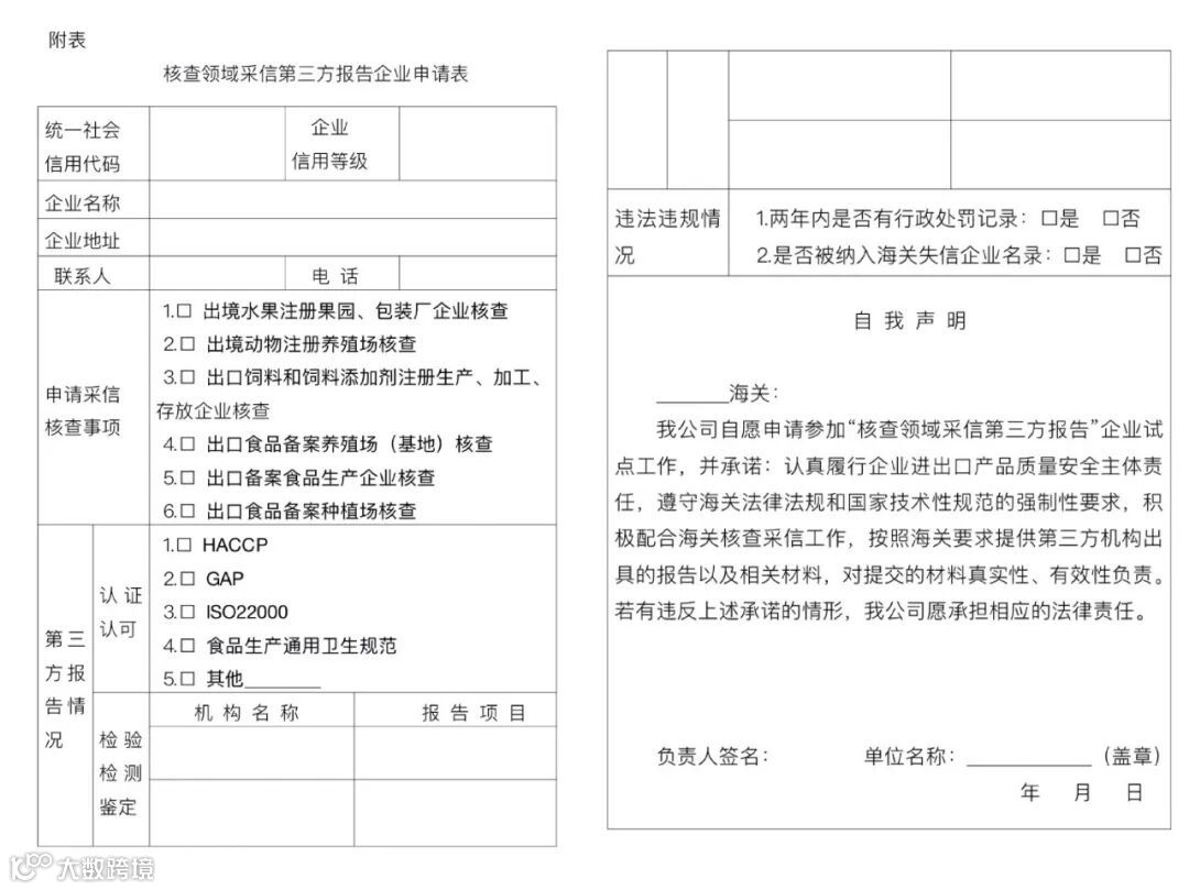 被核查企业需要提交《核查领域采信第三方报告企业申请表》(见下图)及相关自我声明材料,并承诺对提交材料的真实性、有效性负责。