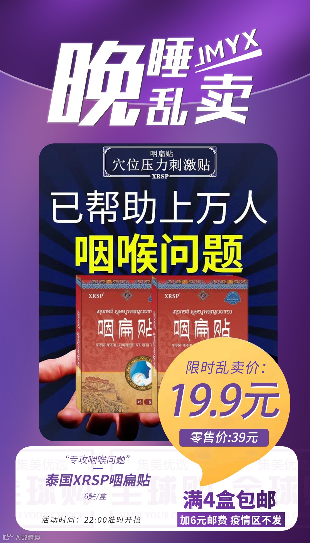 【晚睡乱卖·4盒包邮】泰国XRSP咽扁贴6贴/盒 原价:39元 粉丝群补贴价:19.9元
