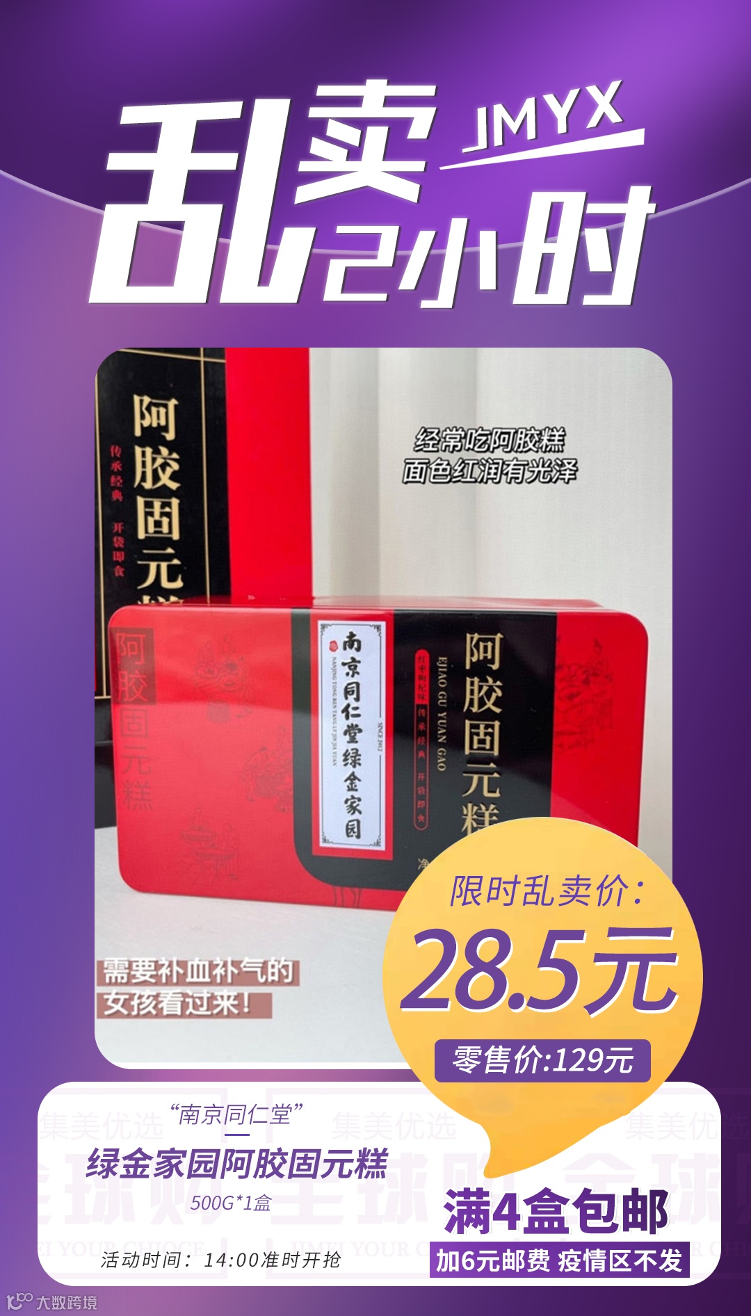 【乱卖2小时*满4盒包邮】南京同仁堂绿金家园阿胶固元糕500g*1盒 原价:129元 粉丝群补贴价:28.5元