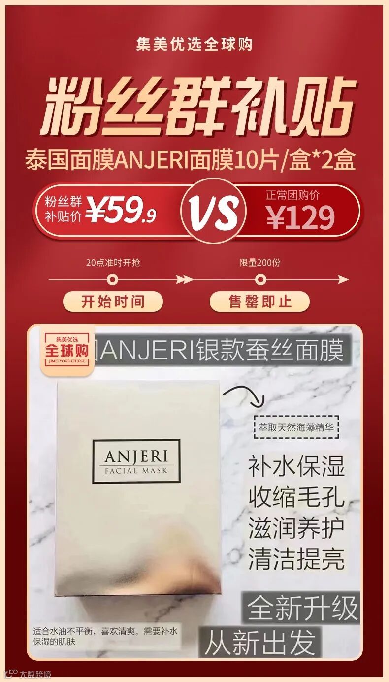 【粉丝群补贴】泰国面膜anjeri面膜35g/片 10片/盒*2盒(金银可选) 原价:129元 粉丝群补贴价:59.9元