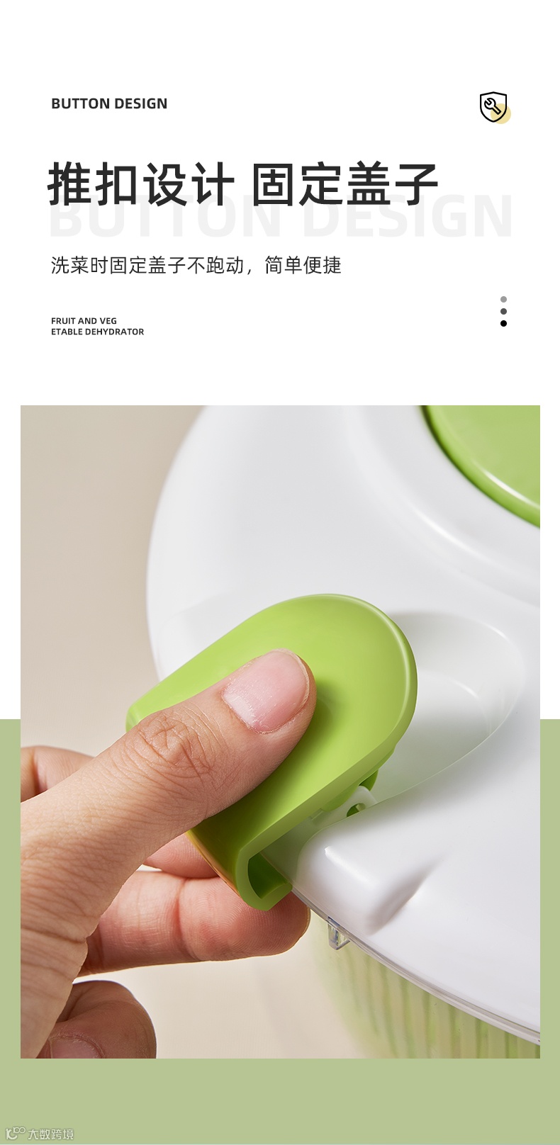 两边的卡扣设计,轻松固定不移位。卡扣搭配圆形手柄设计,把握更加舒适,360°快速旋转,洗菜甩干更加省力省时。