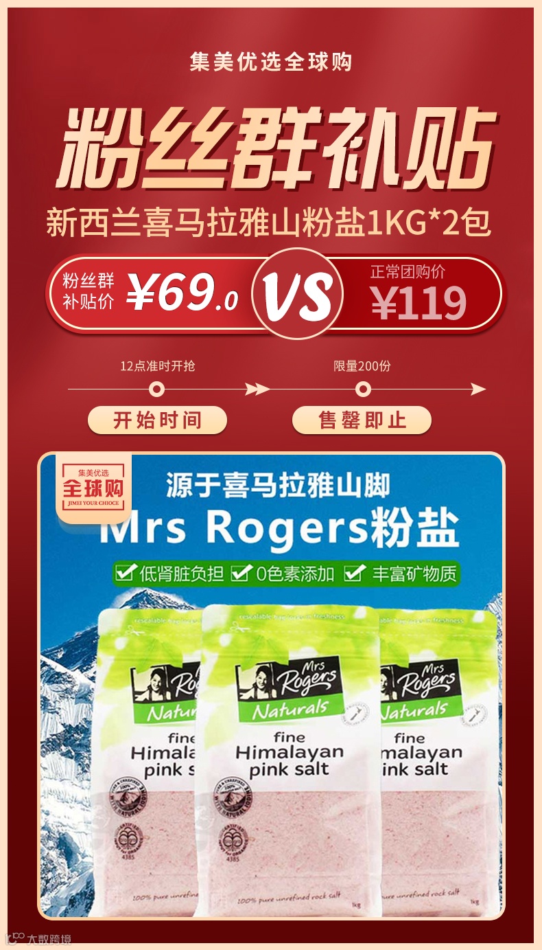 【粉丝群补贴】新西兰Mrs Rogers喜马拉雅山天然盐玫瑰盐1kg*2包 原价:119元