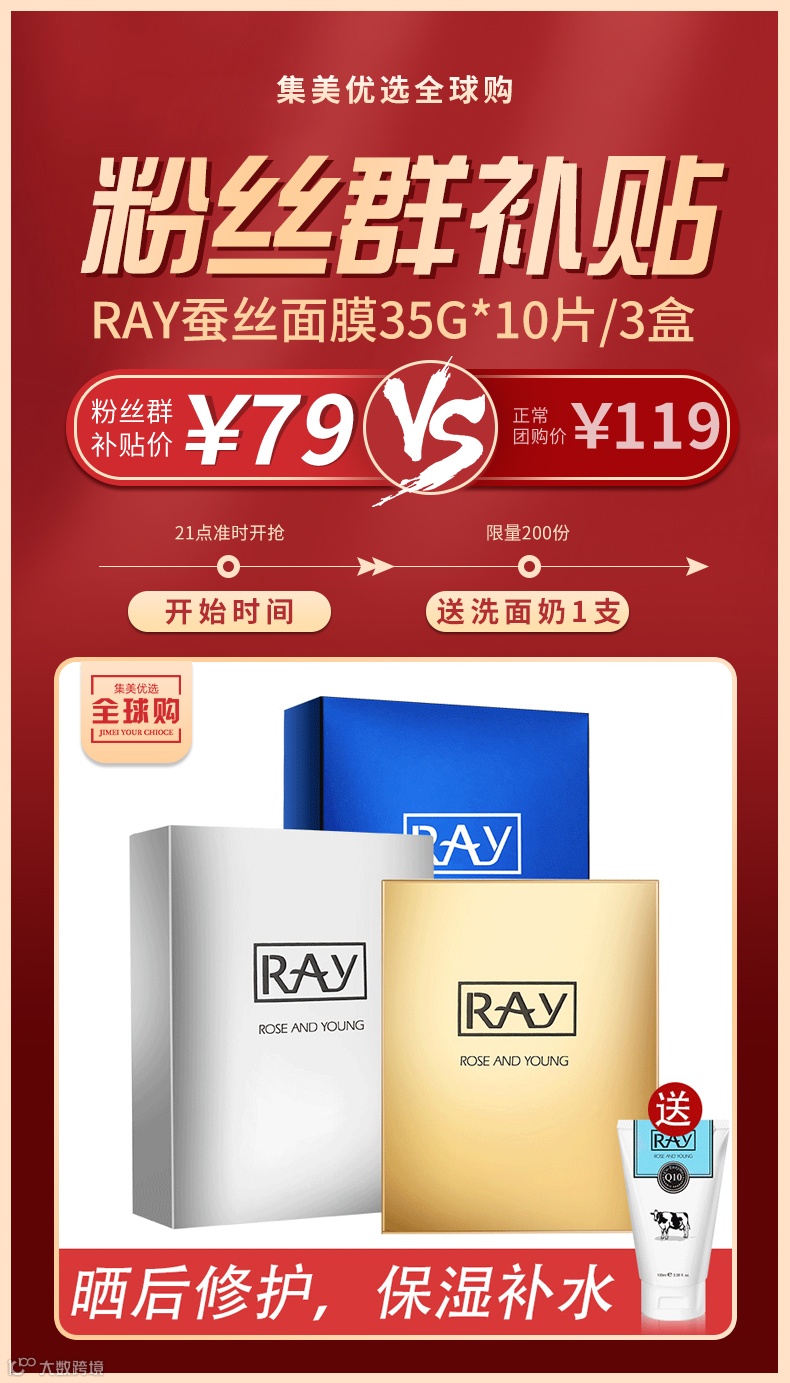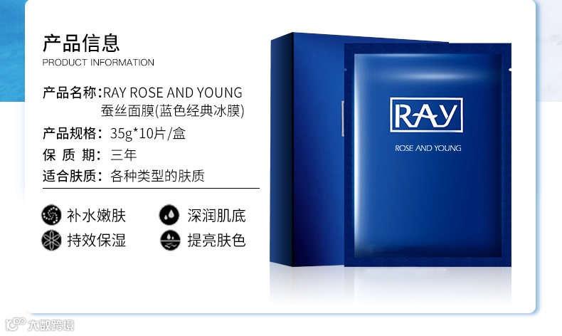 【粉丝群补贴】RAY rose and young蚕丝面膜金色+银色+蓝色经典35g*10片/盒(送洗面奶1支) 原价:119元 粉丝群补贴价:79元