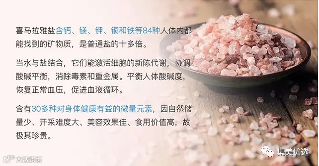 富含钙、镁、钾、铜和铁等84种人体内都能找到的矿物质,是普通盐的十多倍。
