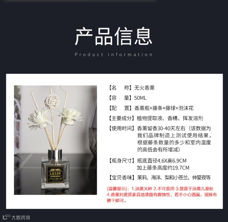 【粉丝群补贴】洛奥无火香薰方瓶50ML(香薰瓶+藤条+藤球+泡沫花)香型随机 原价:49元 粉丝群补贴价:19.9元