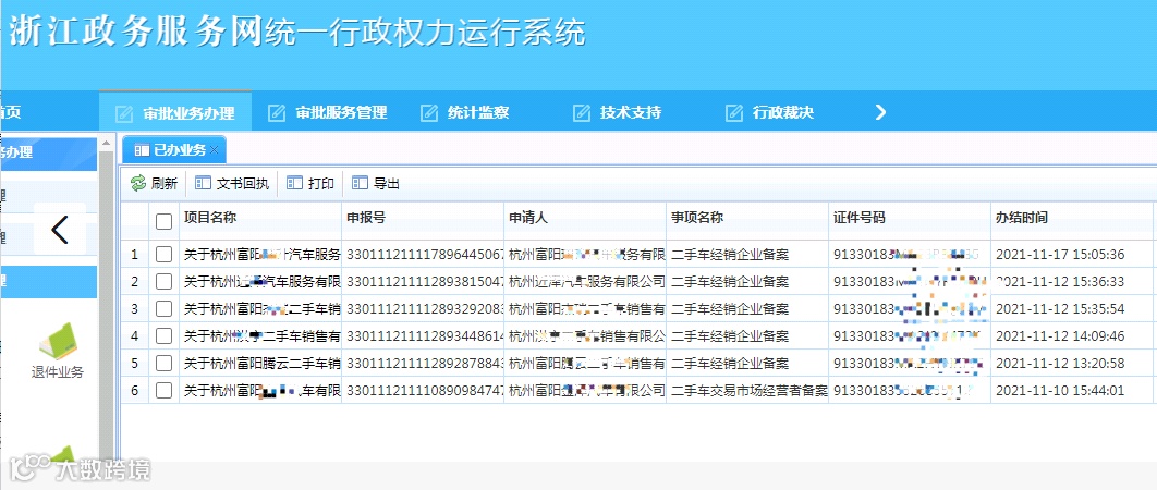 原来,作为代办员,方经理周五通过浙江政务网替市场里的4家经营户提交了二手车经营主体备案申请,隔了一个周末,就拿到了全部证书原件。此前,区行政中心商务窗口工作人员已经联系过方经理,全程指导完成该事项的测试流程。这次正式使用,填报过程自然驾轻就熟。