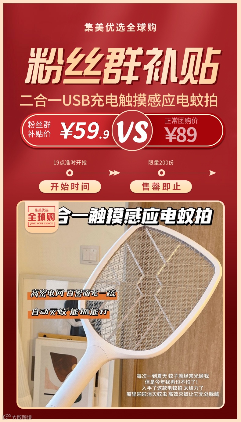 【粉丝群补贴】二合一USB充电触摸感应电蚊拍 原价:89元 粉丝群补贴价:59.9元