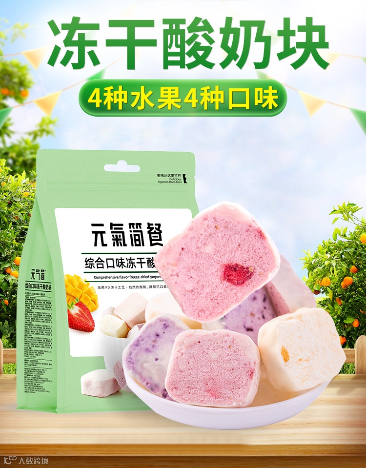 包含4种口味的冻干酸奶块(芒果、草莓、蓝莓、黄桃),每一种口味都独特酥脆,一口一个停不下来。