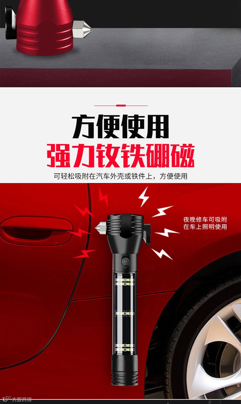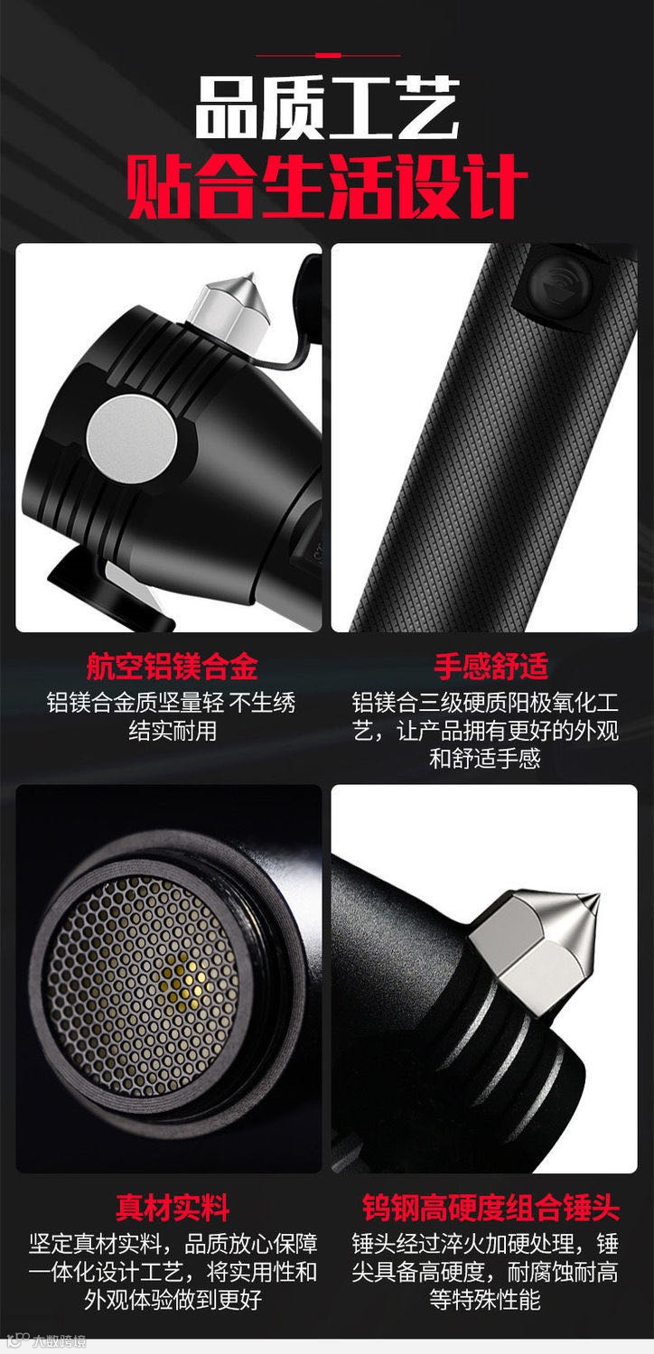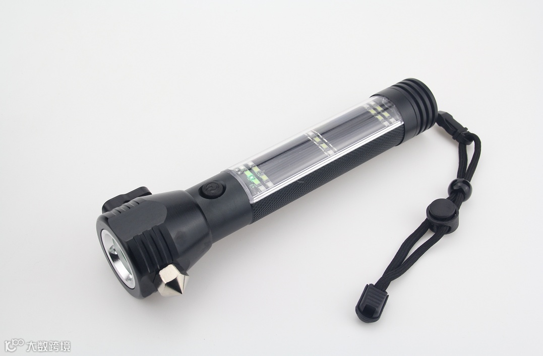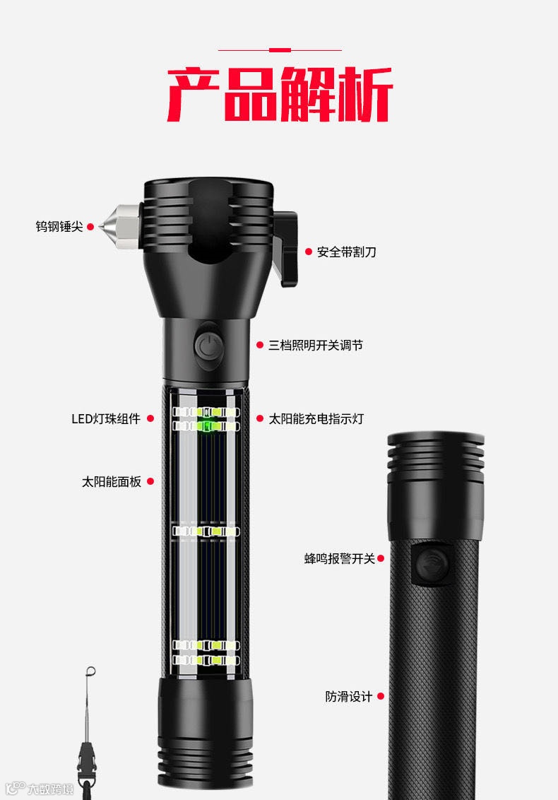 今天推荐这款手电筒,堪称多功能车载强光手电,不仅是手电,自带太阳能充电板,只要有光就有电,还有强磁吸附、破窗锤、割绳器、红蓝闪、警示喇叭、充电宝等功能