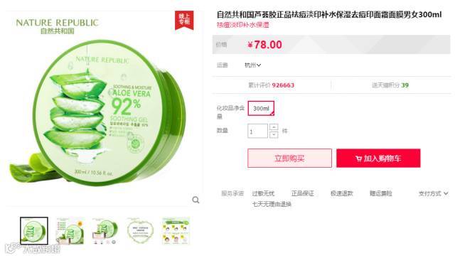 【大牌团购】韩国Nature Republic 万能补水保湿芦荟凝胶300ml 原价:69元 大牌团购价:29元