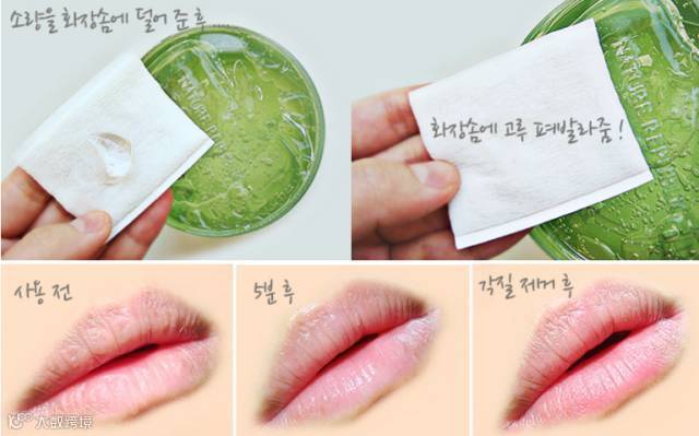 泥萌会不会和小编一样也喜欢咬嘴唇?常年(?)咬嘴唇的后果是嘴唇24小时都会有起皮的现象!真是悲催呢~ 这个时候也可以用到芦荟胶哦~!取适量的芦荟胶在化妆棉上,敷在嘴唇上就可以啦~!敷完不要再咬嘴唇了哦,芦荟胶吃着很苦呢~ 哈哈