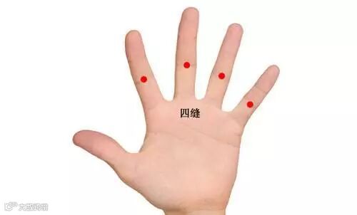 四缝在第2~5指掌侧,近端指关节的中央,一侧四穴。仰掌伸指,当手第二-五指第一指关节处取穴。点刺0.1-0.2寸,挤出少量黄白色透明样粘液或出血,隔一两天扎一次,治疗小儿疳积有很好的效果。