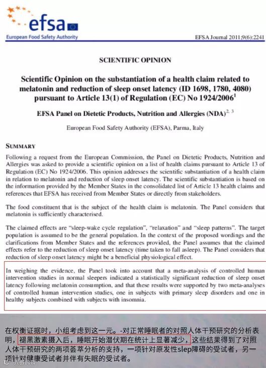 2011年,欧洲食品安全局(European Food Safety Authority)开展了针对褪黑素的研究证据回顾,并下结论称:“褪黑素可帮助减少入睡所需的时间。”