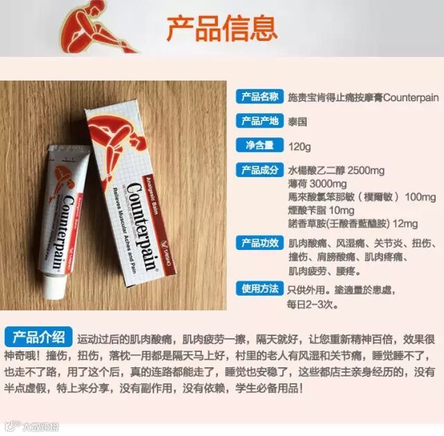 【大牌团购】泰国施贵宝肯得Counterpain肌肉酸痛运动扭伤按摩膏温热120g 原价:59元 大牌团购价:49元 泰国生产的药物总是能够给人一种安全感,因为不管从安全性还是有效性来说都是特别不错的。泰国酸痛膏功效这款产品在泰国当地非常有名,对肌肉酸痛,运动撞伤扭伤及风湿关节痛有特效,它能快速减轻你的疼痛,是户外运动及居家常备的止痛膏,而且在整个业内的口碑也特别好。但是依旧有很多人不太知道它的功效和作用,所以今天我们要跟大家分享一下关于泰国酸痛膏功效。