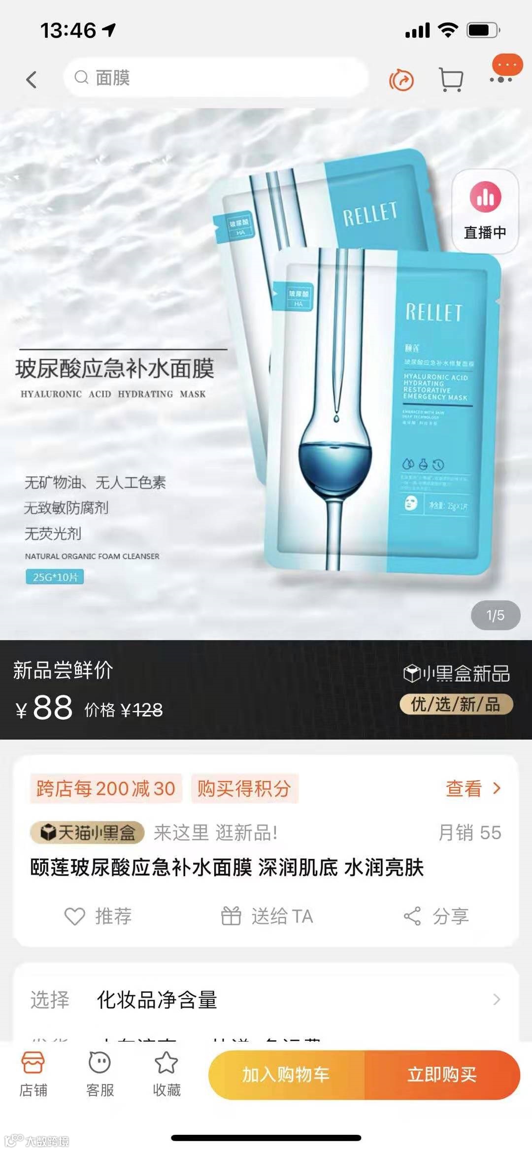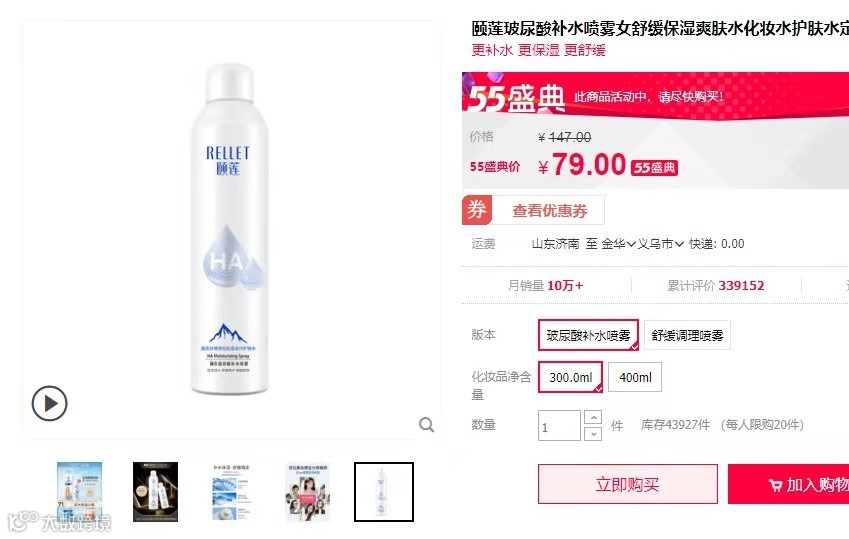 补水喷雾官网售价79/瓶,玻尿酸应急补水修复面膜10片装官网售价89/盒