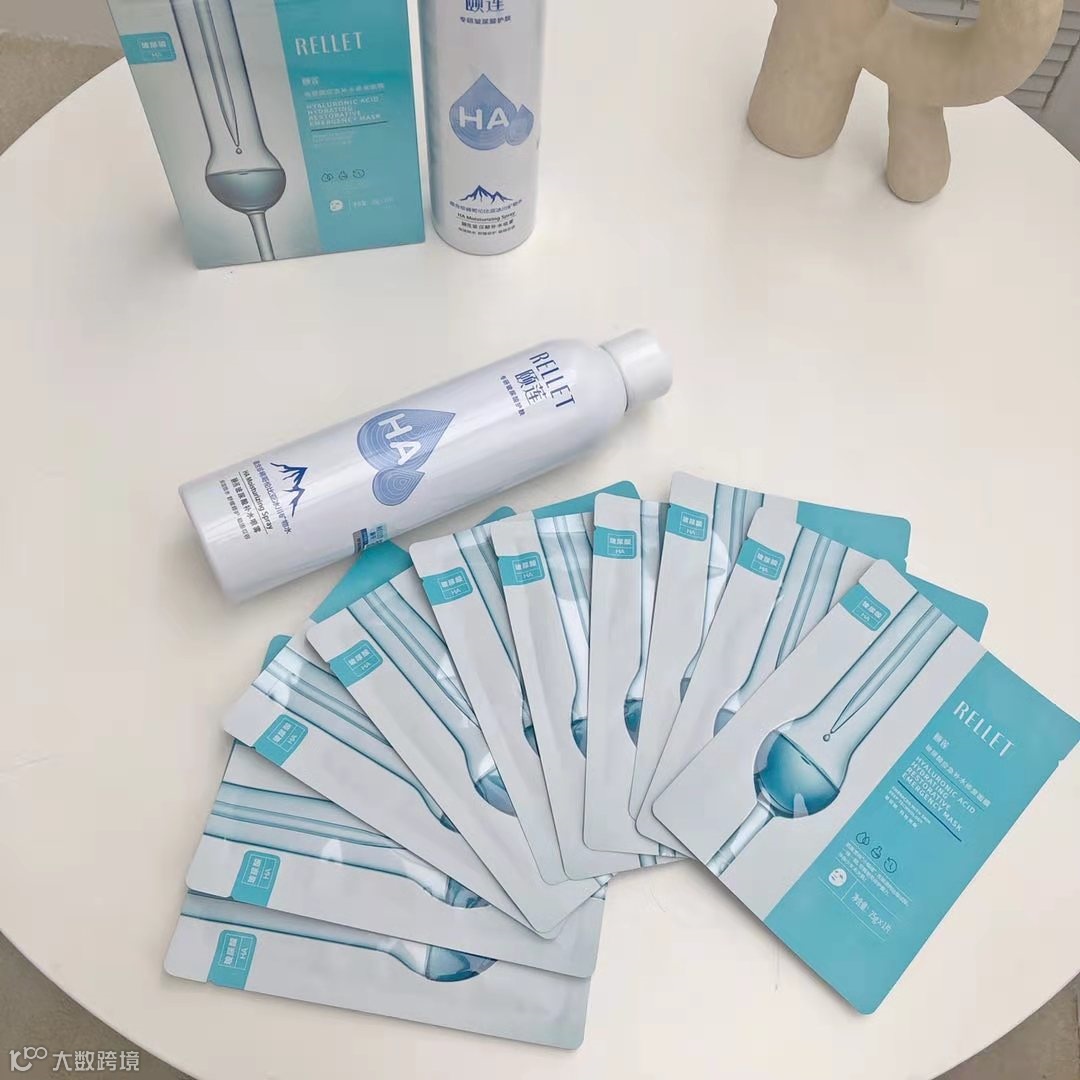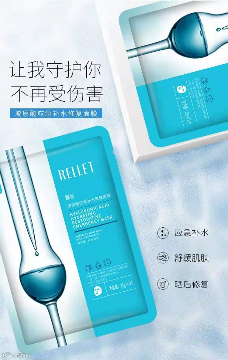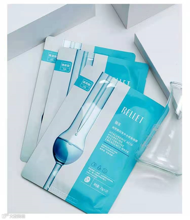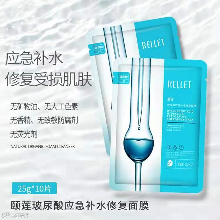 然后再来说说这个RELLET玻尿酸应急补水修复面膜RELLET玻尿酸应急补水修复面膜,应急补水修复受损肌肤,无矿物油、无人工色素、无致敏、无防腐剂、无荧光剂,5大精萃呵护肌肤,滴滴精华。