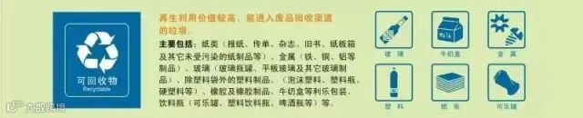 可回收垃圾指回收后经过再加工可以成为生产原料或经过整理可以再利用的物品,主要包括:纸类、塑料类、玻璃类、金属类、织物类、电子废弃物等。