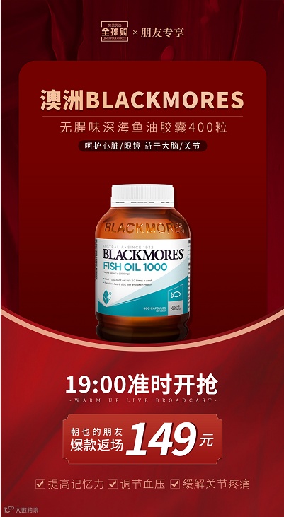 【大牌团购】Blackmores澳佳宝 无腥味深海鱼油 欧米伽3软胶囊400粒 原价:189元 大牌团购价:149元 鱼油中含有丰富的多不饱和脂肪酸Omega-3,是人体自身无法合成的必需脂肪酸,需要通过食物或者营养素来足量补充。 这款鱼油甄选深海小鱼,符合澳洲药物管理局(TGA)生产标准,无腥味,适用所有人群。