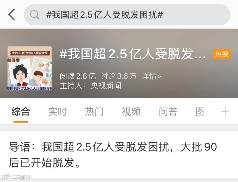 国家卫健委发布的数据显示,中国已有超过2.5 亿人正饱受脱发的困扰,平均每6人中就有1人脱发。其中,大批90后也已经加入到脱发的阵营中。这几天更是霸占热搜榜引起热议!你脱发吗?