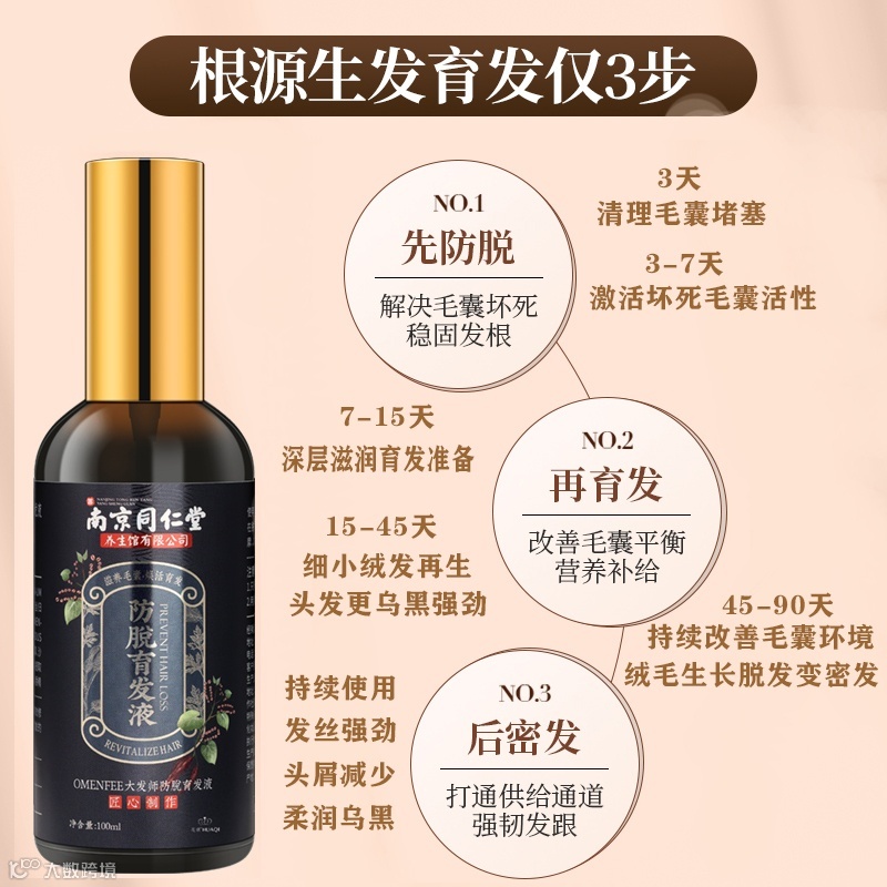 【卖点】随着生活节奏的加快、年纪的增长、睡眠质量的不足,油脂性脱发已经成为这个时代普遍痛点之一。头皮堵塞容易导致头皮屑过多、头皮瘙痒、红肿。如何让国人拥有乌黑浓密的健康秀发,保持美丽形象是每一个中药企业专心研究的方向。南京同仁堂防脱育发液,国家特妆认证,经过国家检验备案。成分草本植物萃取,是一款无副作用,不含致癌物的不含化学配剂的天然产品。何首乌、侧柏叶、当归、沙棘等多种植物育发防脱精华,有效修复头皮发根修复毛囊,达到防脱育发的效果。
