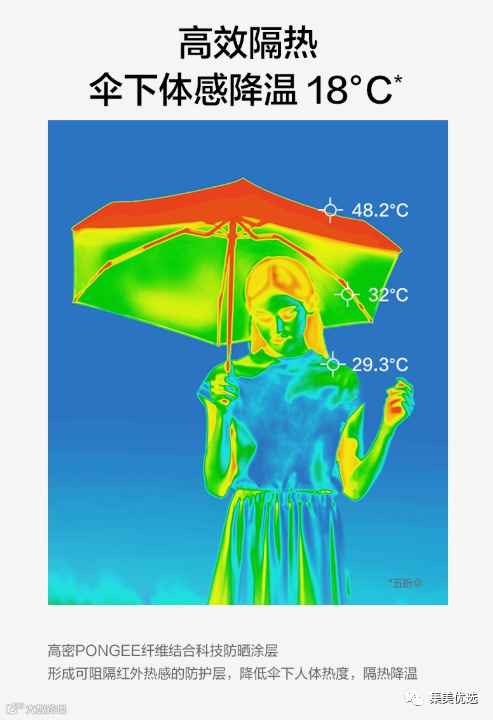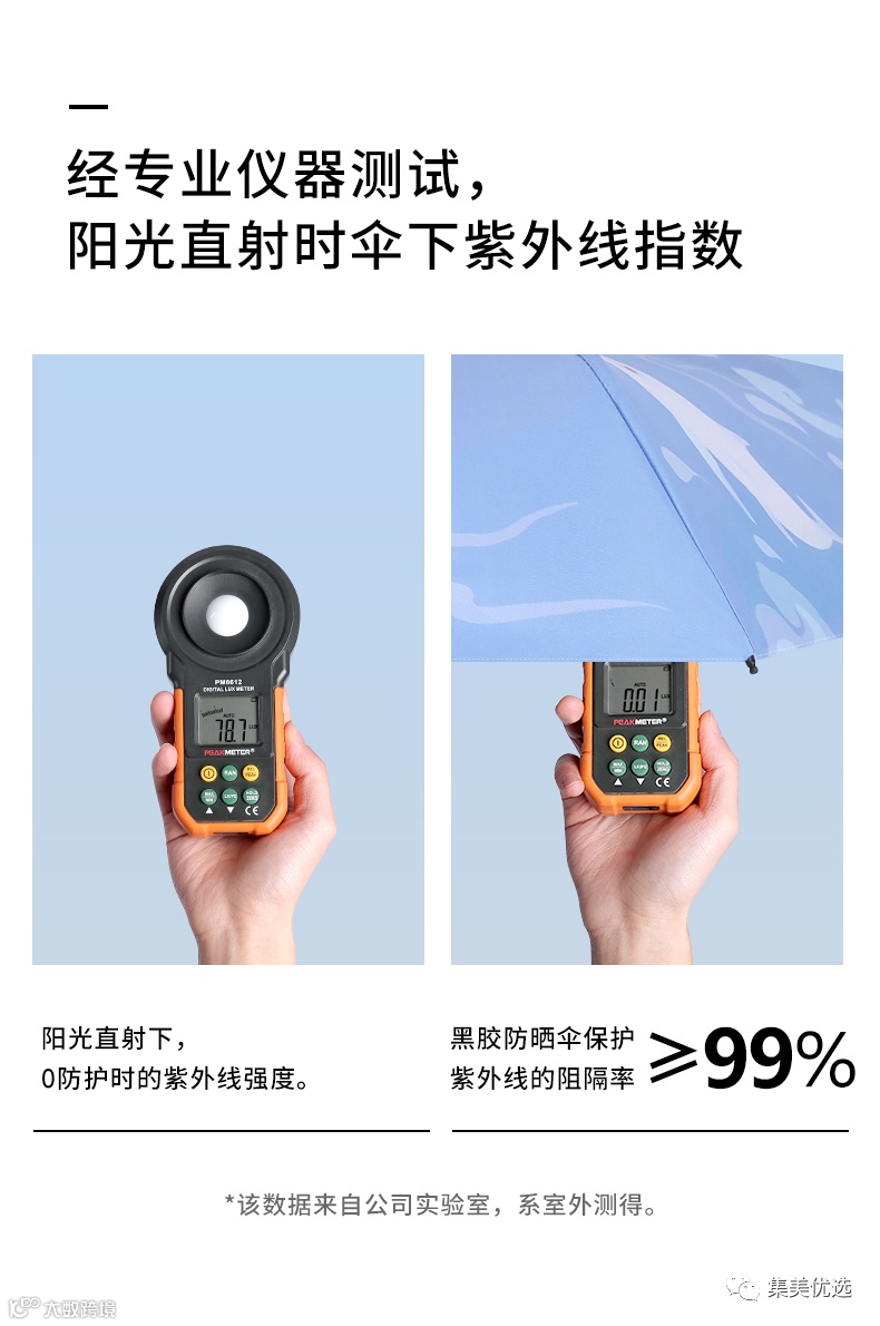 屹然蕉下——真正的“0透光”,UPF50+,阻隔99%的紫外线,最简单的测试方式是直接用手机电筒贴着伞面从外往里照,高端布面材料几乎不透光,一般的布面材料会有很多“沙眼”甚至照射区域一圈透光!我们所用的配件都是精挑细选,为使质量得到稳定,都是由品牌方直接监管定制!
