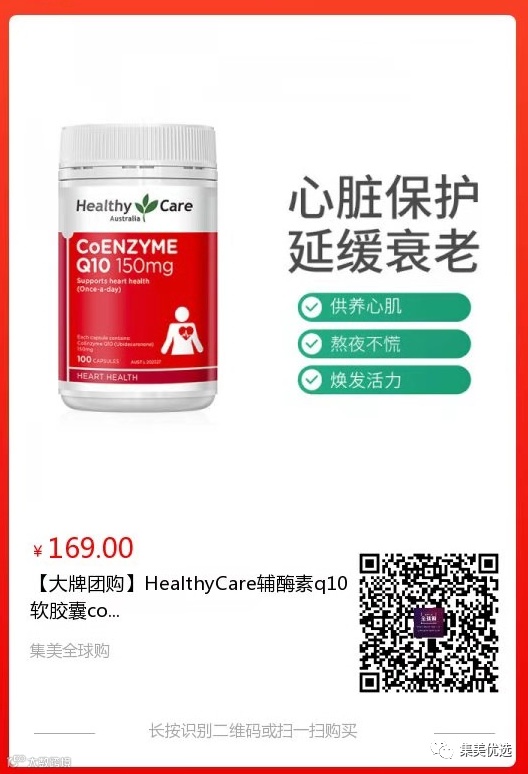 【大牌团购】HealthyCare辅酶素q10软胶囊 150mg 原价:189元 SVIP福利补贴价:159元 辅酶Q10软胶囊,专注“护心养血管”,具有提高免疫力的保健功能。其每粒含辅酶Q10高达150mg。