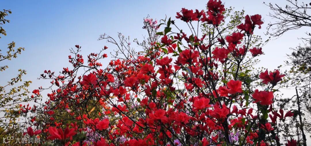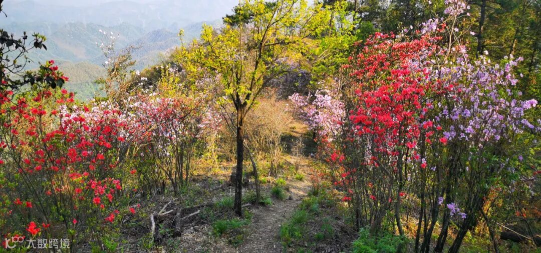 站在唐峰尖上,微风徐徐,淡紫色和红色的映山红互相映衬、层层叠叠,交织成一片春的海洋,从一个山头蔓延到另一个山头,叫人流连忘返。