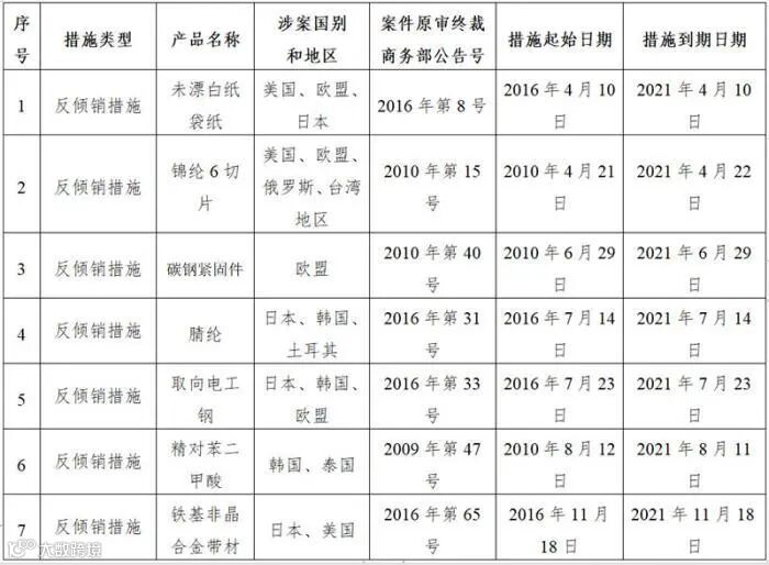 商务部贸易救济调查局10日发布关于2021年部分反倾销措施即将到期的通知,涉及未漂白纸袋纸、锦纶6切片、碳钢紧固件、腈纶、取向电工钢、精对苯二甲酸、铁基非晶合金带材等产品。通知指出,根据规定,反倾销税的征收期限和价格承诺的履行期限不超过5年;但是,经复审确定终止征收反倾销税有可能导致倾销和损害的继续或者再度发生的,反倾销税的征收期限可以适当延长。