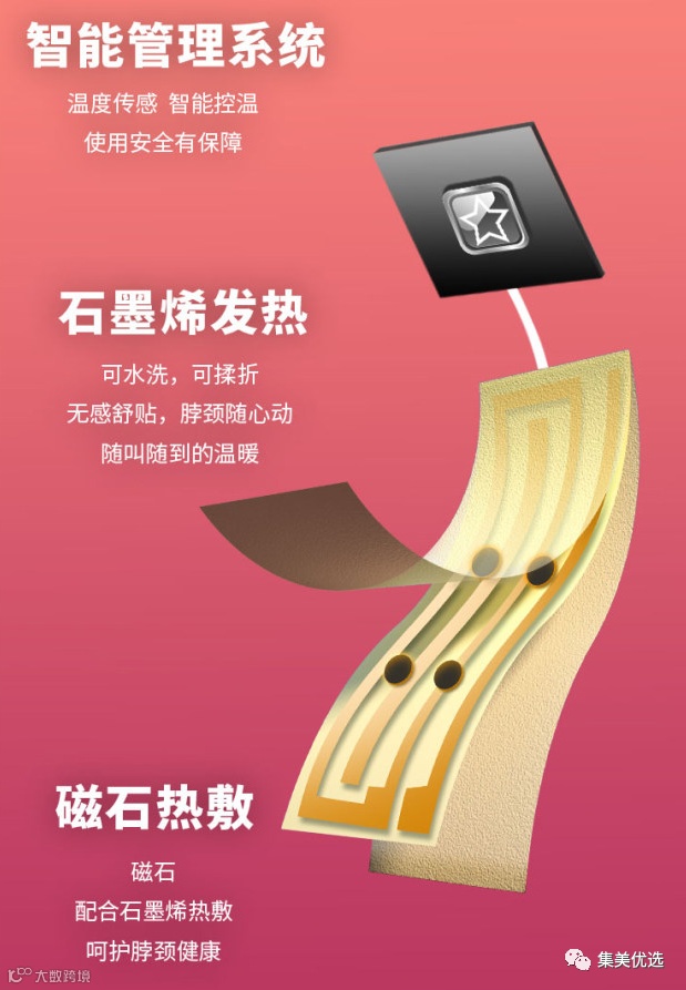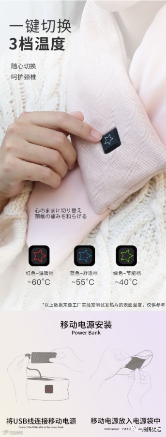 ❶石墨烯发热,三秒速热智能恒温,无辐射危险,更加节能省电,缓解颈椎疲劳,促进血液循环