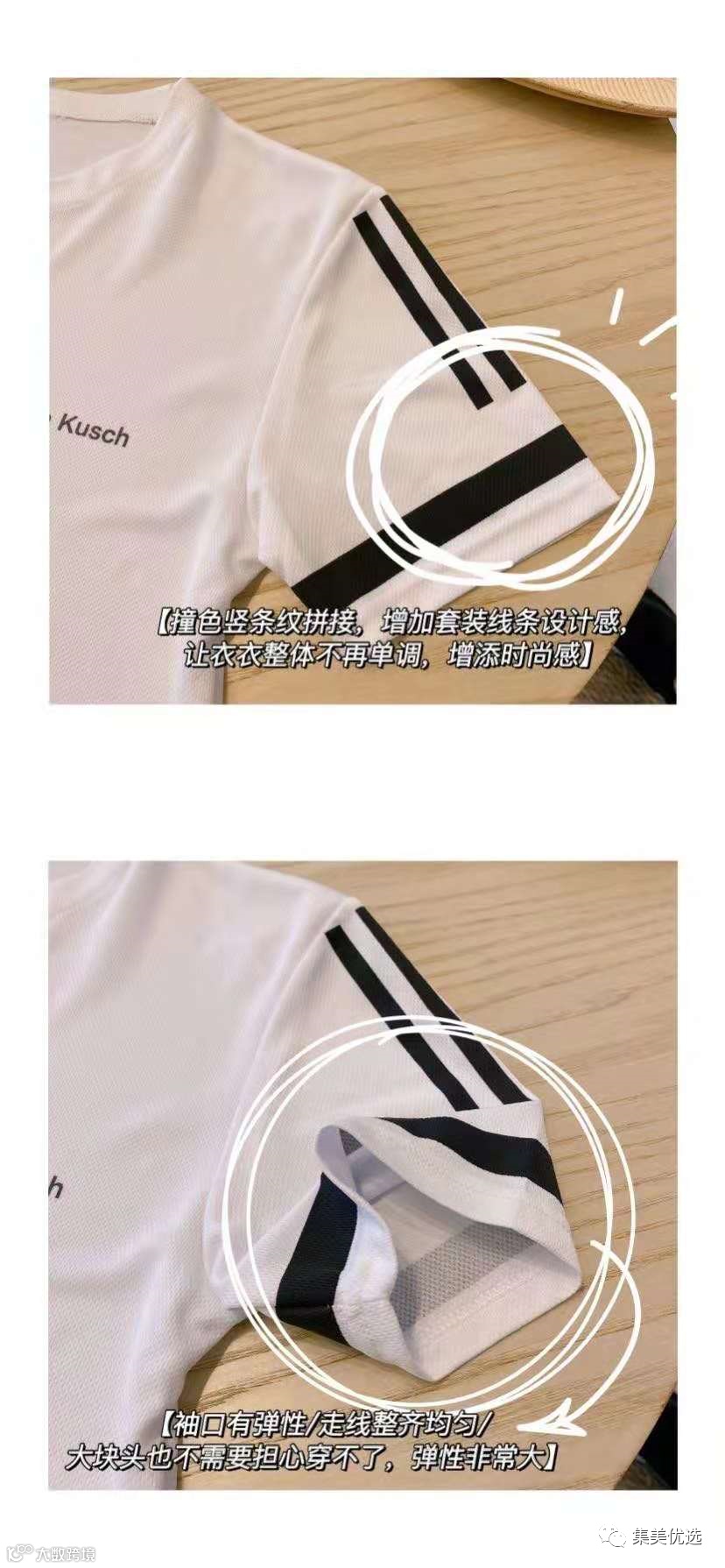 圆领设计,简单大方,撞色竖条纹拼接,增加了整体休闲感,袖边做了双杠设计,撞色条纹永不过时,H版型也把身材修饰考虑到极致了呐~