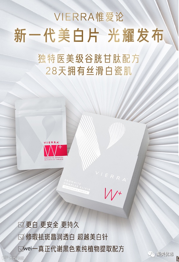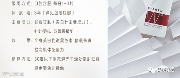 VIERRA美白片中除了美白针的主要成分“谷胱甘肽”以外,还含有针叶樱桃左旋植物VC和玫瑰果精华持续对抗黑色素,三重美白配方, 从根源阻断黑色素形成,褪黑不返黑,淡化色斑,提亮,实现零死角美白焕亮肌肤的功效。