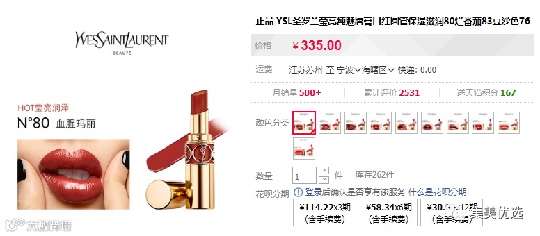 【YSL 80】这支可以说是被李佳琦一句OMG带到断货的!番茄调,质地滋润,一点都不拔干,像涂润唇膏一样,日常素颜薄涂也能hold住,可以说是YSL目前最火的口红了。显白,任何肤色的女性都可以购买使用。
