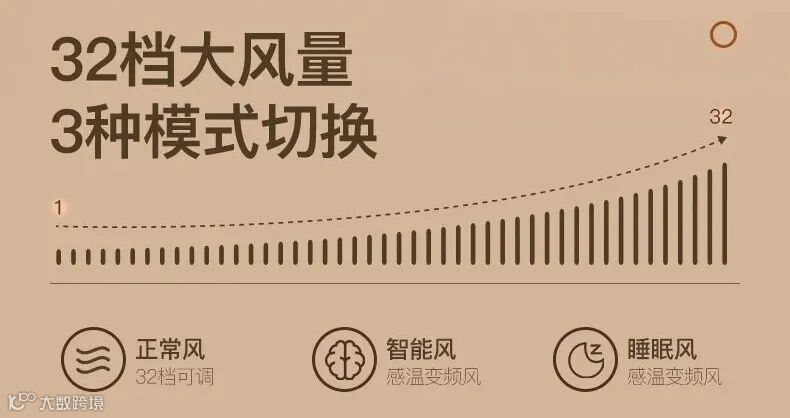 而为了照顾到不同人群的体质、体感,更把风速细分为32档可调风量与3种模式切换,总有一档适合你,其中专为睡眠定制了“睡眠风模式”!在此模式下,风力会逐渐变小到最低档位,助你甜蜜入梦。。。