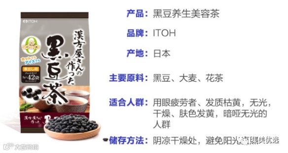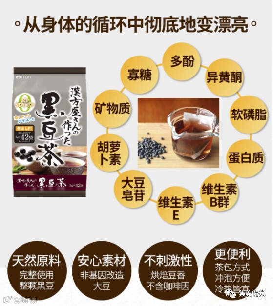 经过烘焙炒制后的黑豆茶属于温性茶 特别适合脾胃虚弱和体质偏寒的女孩子 内在滋补气血,外在活力焕发 有效改善早衰,增加抗氧化 井藤汉方 黑豆茶