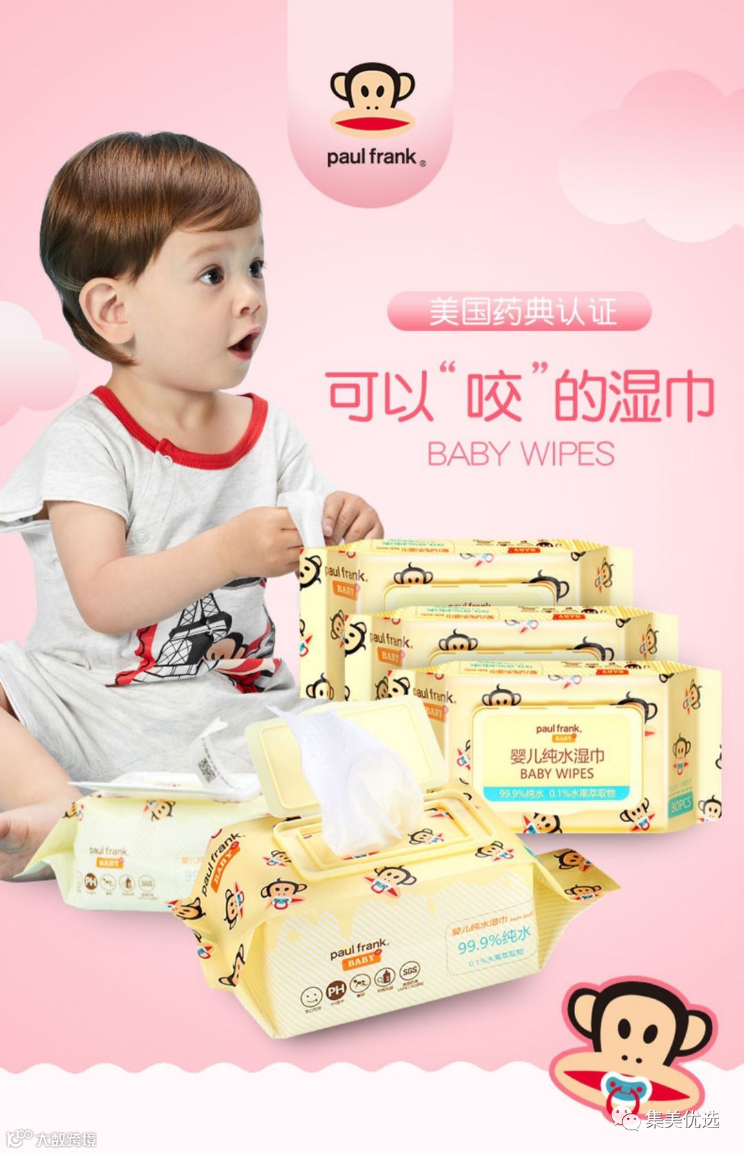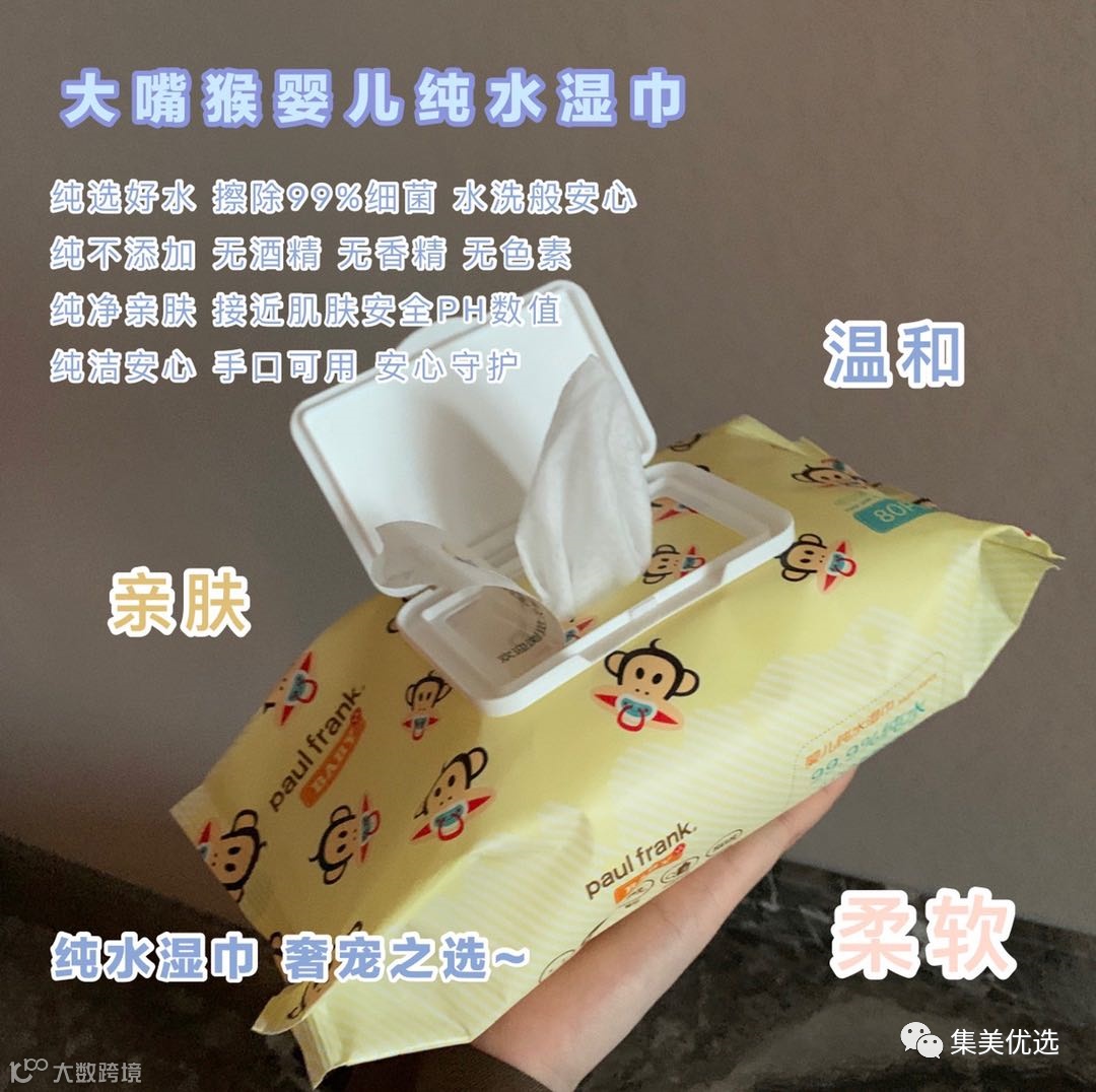 【大牌团购】大嘴猴婴儿纯水湿巾80抽带盖 4包 原价:79元 SVIP福利补贴价:39.9元 99.9%纯水,给宝宝不一样的呵护-大嘴猴婴儿纯水湿巾