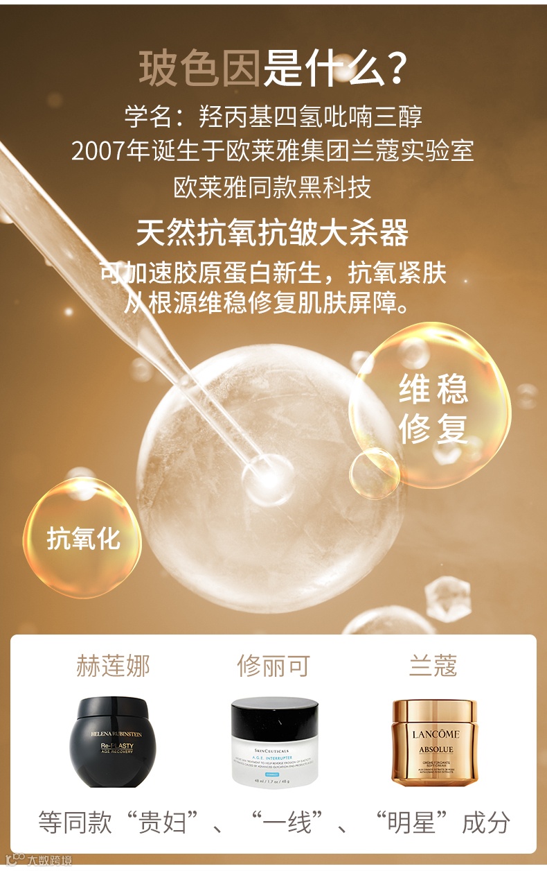 上市不久奖状就拿了不少,雅诗兰黛专研F²+AA2G就像个灵敏的探针,能灵巧地定位到需要协助吞噬黑色素的细胞上,蕴含三大有效成分来协同合作:稳定的VC、糖蜜酵母、酵母精粹,三大成分,分别作用于黑色素产生的前、中、后,让黑色素不在胡作非为,从根源提升肌肤的光泽度,尤其是对新生痘印效果非常明显。
