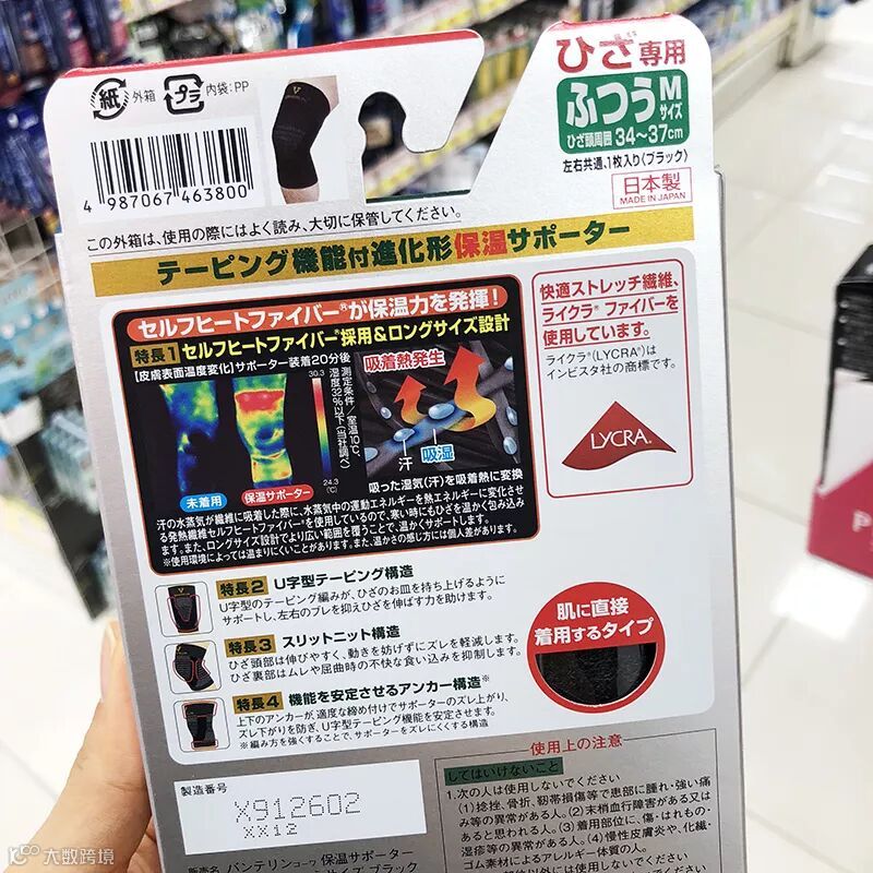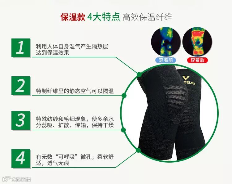 保温功效根据日常生活中肌内效贴原理采用伸缩率不同的3种尼龙丝和各种编制方法,立体编制膝盖弯曲部贴合,不宜上下滑动 。