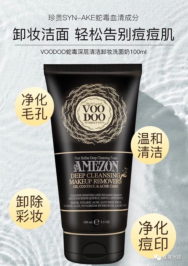 【限时秒杀】泰国VOODOO蛇毒洗面奶洗卸二合一 原价:59元 VIP /黑卡M1会员 福利补贴价:49元 voodoo蛇毒洗面奶含有和蛇毒面膜相同的“SYN-AKE"蛇毒血清蛋白成分,能迅速抑制肌肉收缩,使毛孔缩小,起到紧致肌肤,抗衰抗氧化去皱的功效;