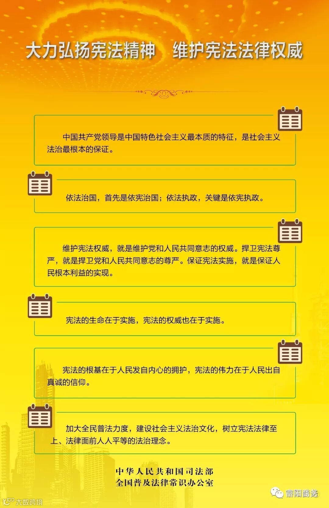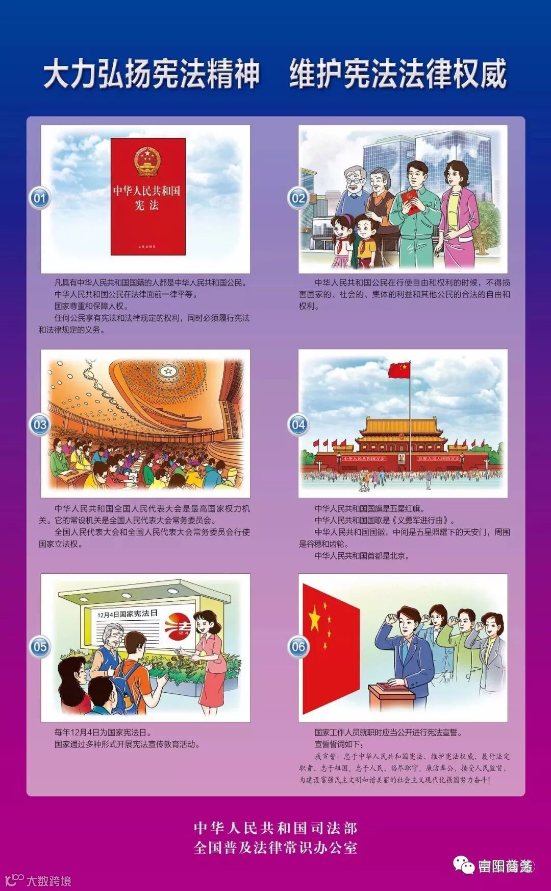 为了推进“尊崇宪法、学习宪法、遵守宪法、维护宪法、运用宪法”主题活动深入开展,推动宪法学习宣传教育“活起来”“落下去”,司法部、全国普法办精心制作了六幅宪法宣传挂图,供全社会学习使用。请动动手指,下载分享。