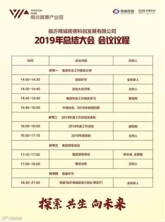 探索共生向未来——临沂商城房德科创发展有限公司2019年总结大会,于2020年1月16日下午14:30分,在临沂商城蓝海大饭店黄海厅正式开始。
