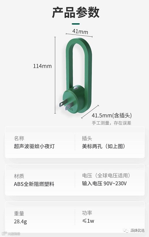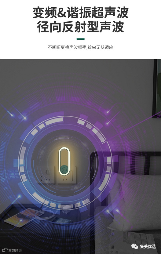 这款超声波驱虫小夜灯,升级采用了更小的超薄陶瓷声波片,采用镜像声波发声,发声孔在产品的背部,利用声波遇到阻碍反射的原理,形成镜像声波,让声波更好的扩散。