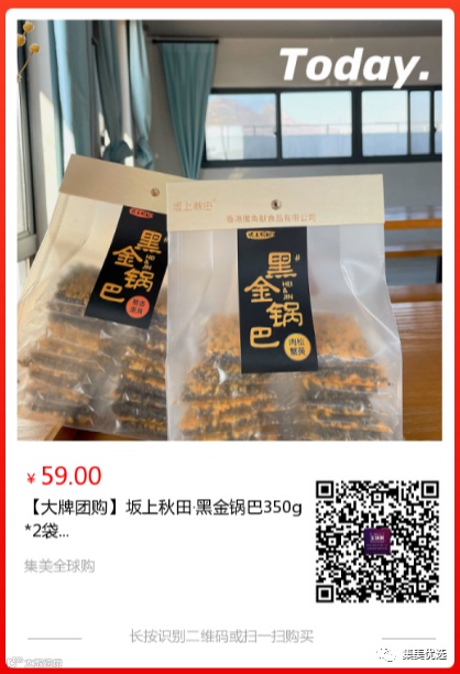 【大牌团购】坂上秋田·黑金锅巴 350g*2袋 原价:68元 大牌团购价:59元 快乐其实很易得,平凡生活中一份让嘴巴快乐的美味,就够啦。 从小到大,各种锅巴都吃过,大米锅巴、小米锅巴、咸的辣的,屡“吃”不爽。可从没见过像这款锅巴这么特别的,裹满蟹香蛋黄,超香酥脆的「黑金锅巴」