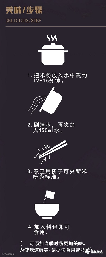 【使用方法】1、将米粉放入水中煮约12-15分钟;2、倒掉水,再次加入450ml水;3、煮至用筷子可夹断米粉为标准;4、加入料包即可食用 【保存方法】置阴凉干燥通风处或放入冰箱冷藏
