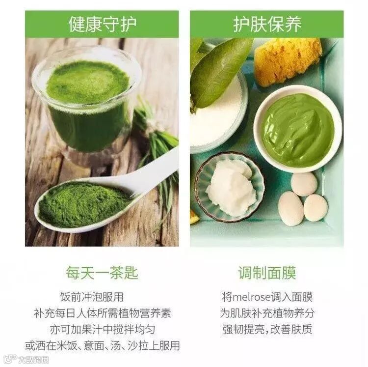 为什么它看着这么绿哦?因为它的原料是新西兰大麦草、小麦草、小球藻、螺旋藻粉、高蛋白质。澳洲Melrose 绿植物粉是普通碱性食物的2万倍,长期食用可以改善体质,增加抵抗力,净化血液,达到排除体内有害毒素作用。